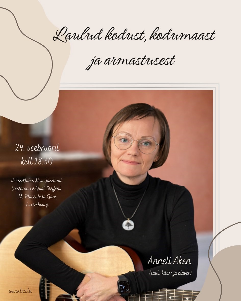 Muusikaga rõõmustab meid paljudele Luksemburgi eestlastele tuttav Anneli Aken. Anneli juhendas 2009-2020 siinsete eesti laste lauluringi ja naisansamblit ning on tänaseni Euroopa Eesti Lastekoori dirigent. Iseseisvuspäeva õhtul on kavas nii tema enda kui ka laenatud laulud – kodust, kodumaast ja armastusest.